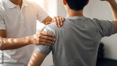 Physiotherapist treating patient with shoulder massage. Physical therapy and injury rehabilitation. Professional male doctor applying pressure to man shoulder for pain relief