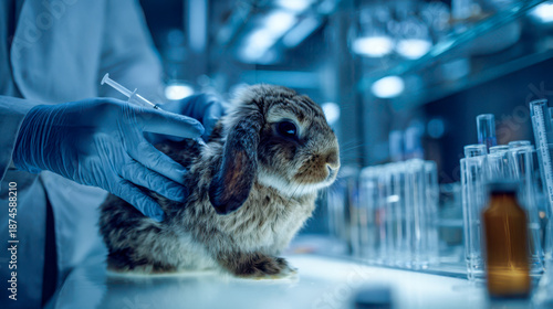 Vet gives vaccine to rabbit in lab during health check in animal care facility setting