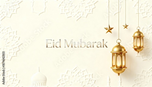 Eid Mubarak greeting card with hanging golden lanterns and stars. Luxury Islamic holiday background with mosque silhouette and geometric pattern. Ramadan Kareem celebration banner