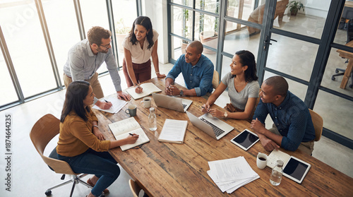 Collaborative Dynamics: A dynamic team of professionals engages in a brainstorming session around a rustic wooden table.