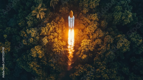 Overhead view of a rocket blasting off above a lush, green tropical forest, leaving a trail of fire