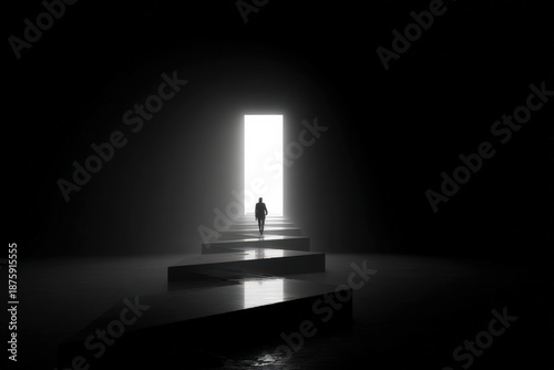 Person walks towards light at the end of a dark corridor in a minimalist space