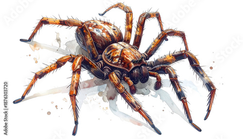 Macro closeup of a hairy brown wolf spider predator isolated on a white background, a scary wild arachnid invertebrate perfect for nature and wildlife photography