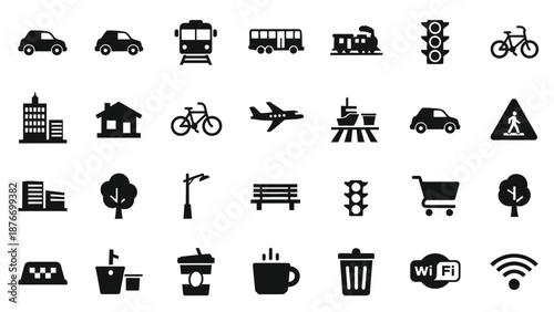 Extensive Set of Urban Life, Transportation, and Daily Activity Icons in a Flat Design Style, isolated white background.