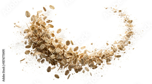 Instant oat flakes with flying grains isolated