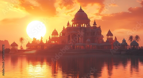 Divine ayodhya ram mandir glowing sunrise reflection high resolution picture