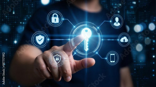 Business person touching secure passwordless authentication key icon