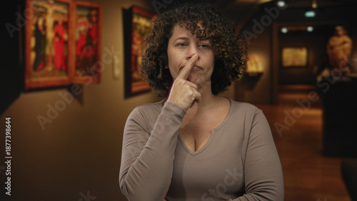 Middle age hispanic woman resting hand on chin while gazing at abstract painting inside building; doubt.