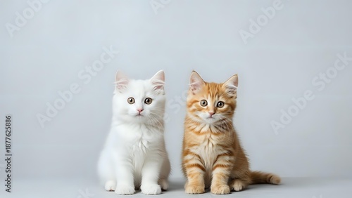 Two adorable kittens sitting together on white background, orange tabby and white fluffy cats, domestic pets for veterinary care and adoption concepts.
