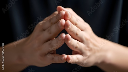 Close Up Of Person Fingers Interlocked Forming a Pyramid Shape on Dark Background Under Soft Lighting