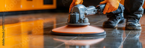 Worker polishes hard floor with machine in bright room Generative AI