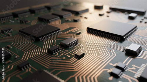 Close-Up of PCB with Integrated Circuits and Copper Traces Highlighting Microelectronic Precision