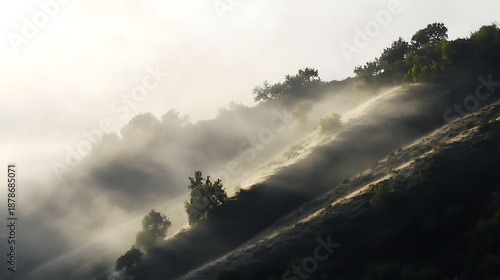 Hilly terrain shrouded in mist with trees atmospheric landscape photo