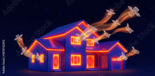 Night view of a house losing money through walls and roof due to poor insulation and heat energy loss, thermal imaging concept with flying dollar bills