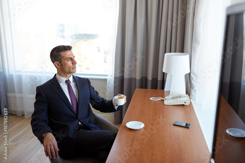 businessman drinking coffee at hotel room