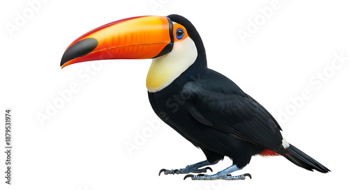 Toco toucan with a large orange beak isolated on a white background.
