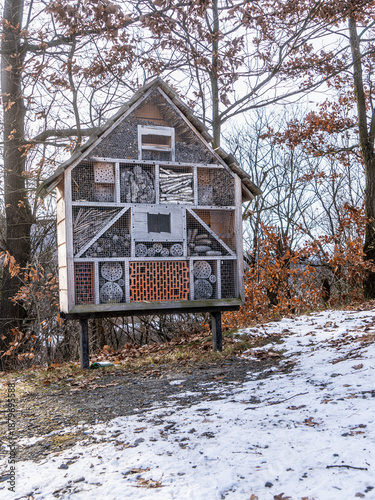 Drewniany domek dla owadów ustawiony na palach w zimowym lesie, element ochrony przyrody i bioróżnorodności.