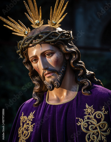 Escultura religiosa de Semana Santa con Jesucristo en actitud de recogimiento. Imagen solemne con iluminación dramática y detalles dorados, ideal para uso editorial y contenido religioso.
