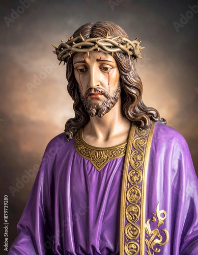 Escultura religiosa de Semana Santa con Jesucristo en actitud de recogimiento. Imagen solemne con iluminación dramática y detalles dorados, ideal para uso editorial y contenido religioso.