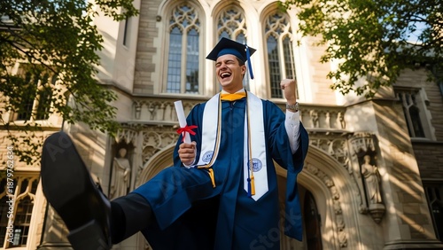 Graduate student celebrating academic achievement outdoors