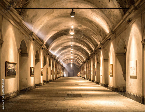 Step into a grand, vaulted art gallery illuminated by warm lights. This atmospheric stone corridor evokes history and elegance, perfect for museum, heritage, and cultural travel themes.