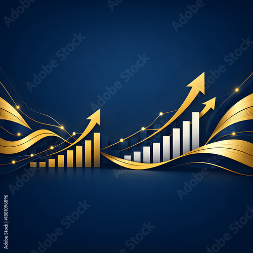 Profesjonalne abstrakcyjne tło korporacyjne z motywami biznesowymi i finansowymi. Złote, płynne linie oraz dynamiczne wykresy wzrostowe skierowane ku górze symbolizują sukces finansowy, rozwój firmy