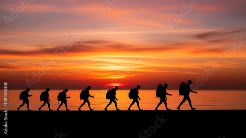 Silhouettes of hikers walking along the shore during a vibrant sunset
