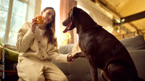 Brown labrador giving paw during training session at home. Concept of dog training promotion, obedience learning, positive reinforcement and pet education advertising indoors.