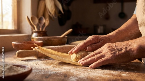 Hands shaping masa into tamales on a floured wooden counter with rustic utensils