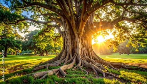 A majestic, large tree with sprawling roots and branches, bathed in golden sunlight filtering through its leaves. Other trees