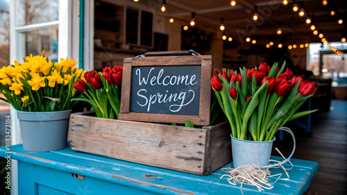 Welcome Spring sign with tulips and daffodils in cozy flower shop interior. Ideal for seasonal promotions, home décor marketing, blogs, and spring-themed designs.