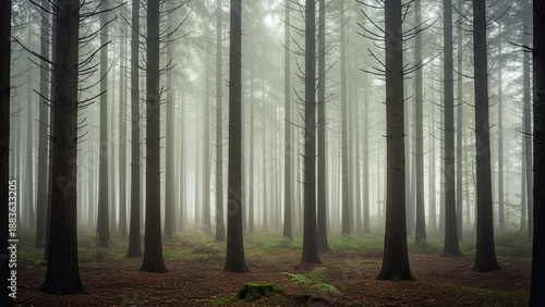 Dense forest of tall trees shrouded in atmospheric morning mist and diffused light
