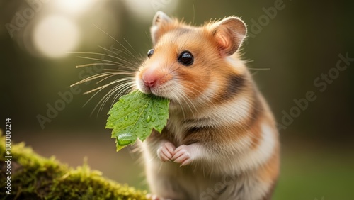 A cute hamster with fluffy fur is holding a green leaf in its mouth while sitting on a mossy branch.