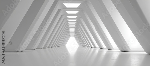 Modern architectural hallway with angled supports leading toward bright light at the vanishing point