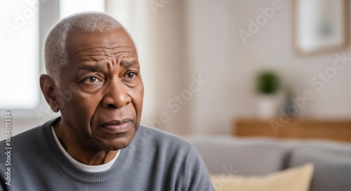 Sad african american man suffering from depression or mental illness. Elderly man dealing with health problems and loneliness, close up.