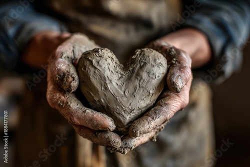 Mãos de artesão segurando um coração moldado em argila crua, conceito de amor pelo artesanato e cerâmica feita à mão.