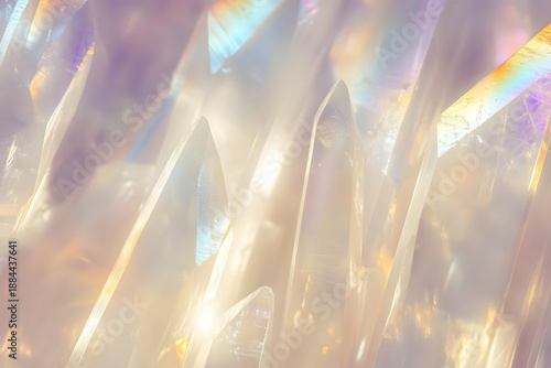 Golden hour lighting on iridescent crystal shards creating a warm glow with multi colored reflections and sharp geometric silhouettes for artistic posters and high end fashion editorial backgrounds