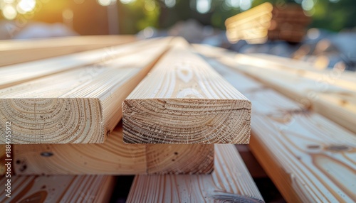 close up of stacked wooden planks with visible wood grain and cut ends, natural lumber material outdoors