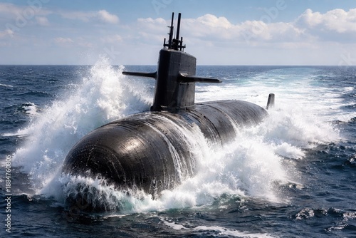 Submarine surfacing through ocean waves, Military submarine emerging from the ocean, surrounded by splashing waves under clear sky, naval technology concept, high detail, maritime defense