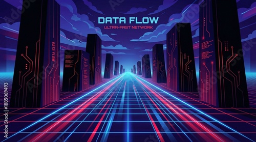 A futuristic digital landscape with neon lights and towering server columns representing a high-speed data flow network