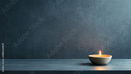 Single oil lamp casting soft light on dark background, minimalist composition.