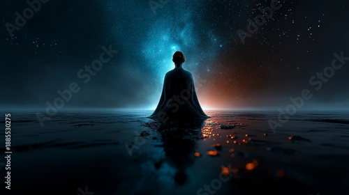 Silhouette einer meditierenden Person auf Wasser vor kosmischem Hintergrund mit Lichtern