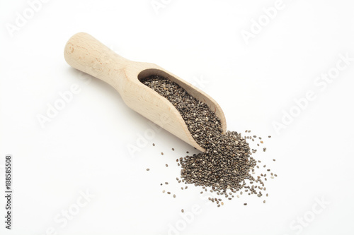Chía en una cuchara de madera sobre fondo blanco, semillas