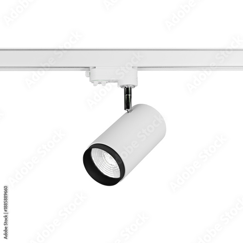 Nowoczesna biała lampa szynowa typu spotlight z czarnym wykończeniem na białym tle.