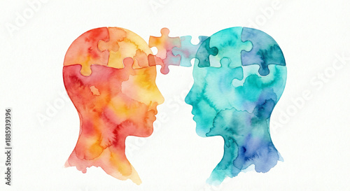 Connessione mentale tra due profili umani in acquerello con pezzi di puzzle