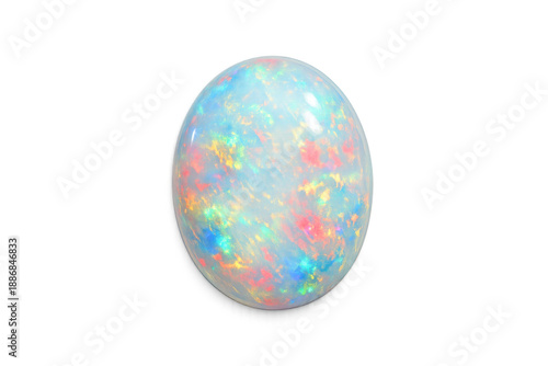 Luminous oval white opal gemstone with vibrant rainbow play-of-color against black background