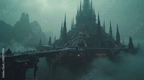 Massive alien fortress emerging from shadowed planetary fog