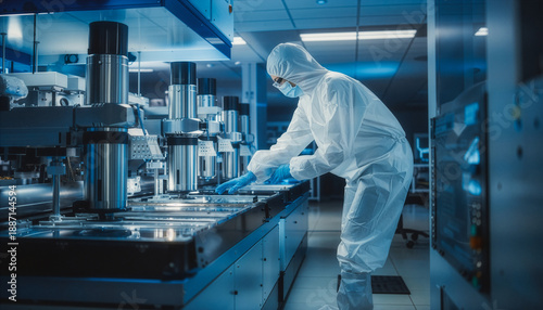 Cleanroom technician adjusting automated semiconductor manufacturing equipment in modern facility