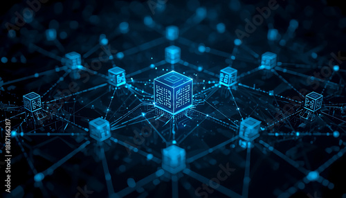 Edge computing concept with distributed servers connected by light paths on dark background with blue glow