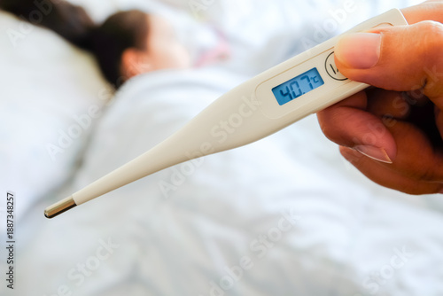 Close-up of a hand holding a digital thermometer showing a high fever of 40.7 degrees Celsius with a blurred sick person lying in bed, emergency medical and family healthcare concept.